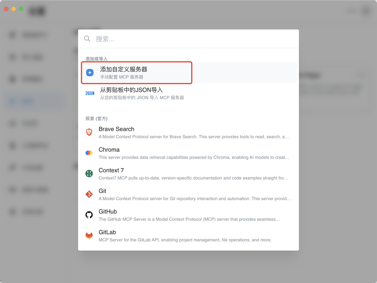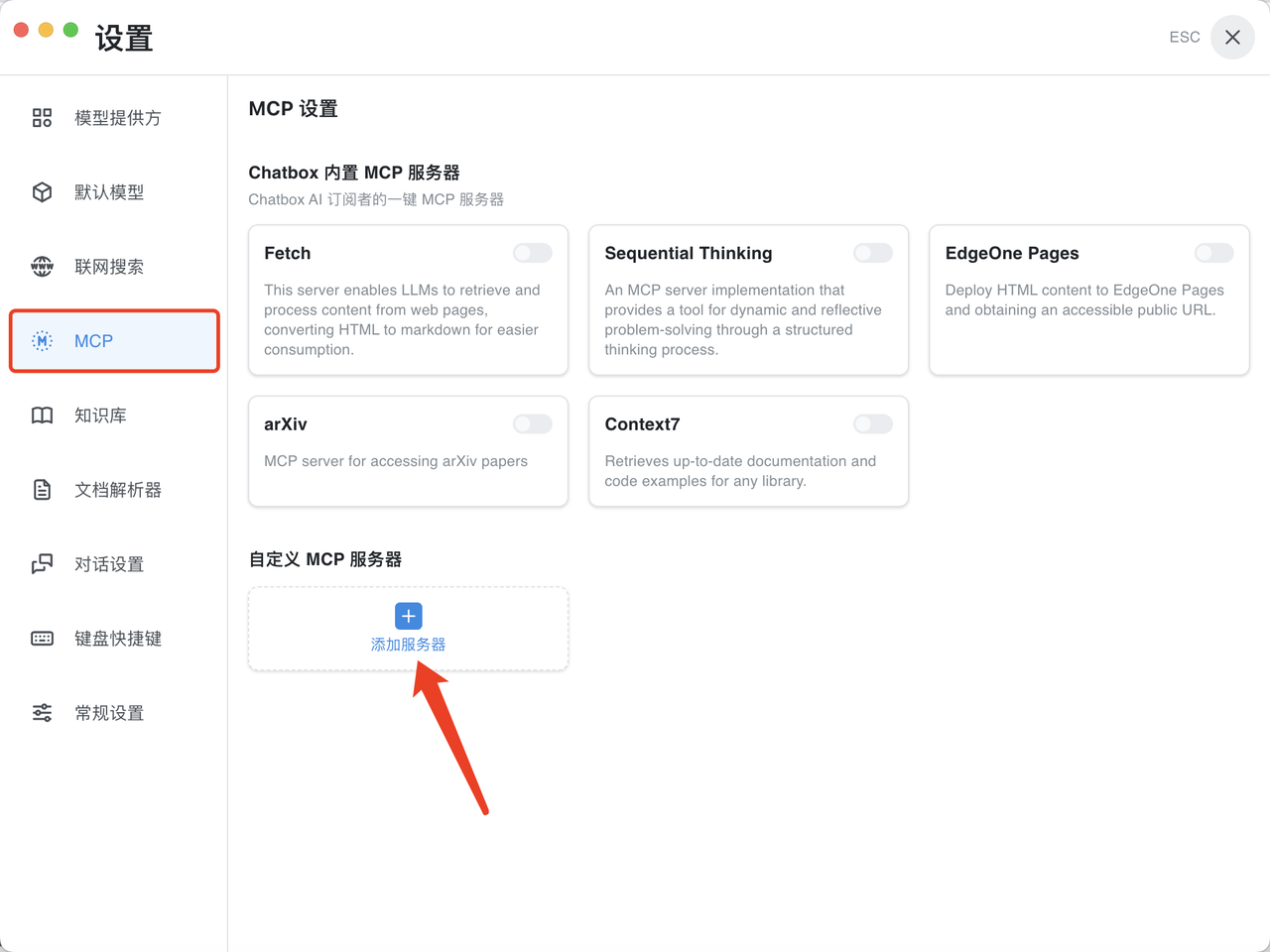 4、进入【MCP】,点击“添加服务器”,选择“添加自定义服务器”