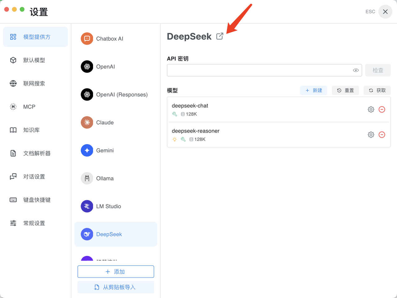 1、返回到设置界面,进入【模型提供方】,选择你想要使用的AI大模型(这里以DeepSeek为例)