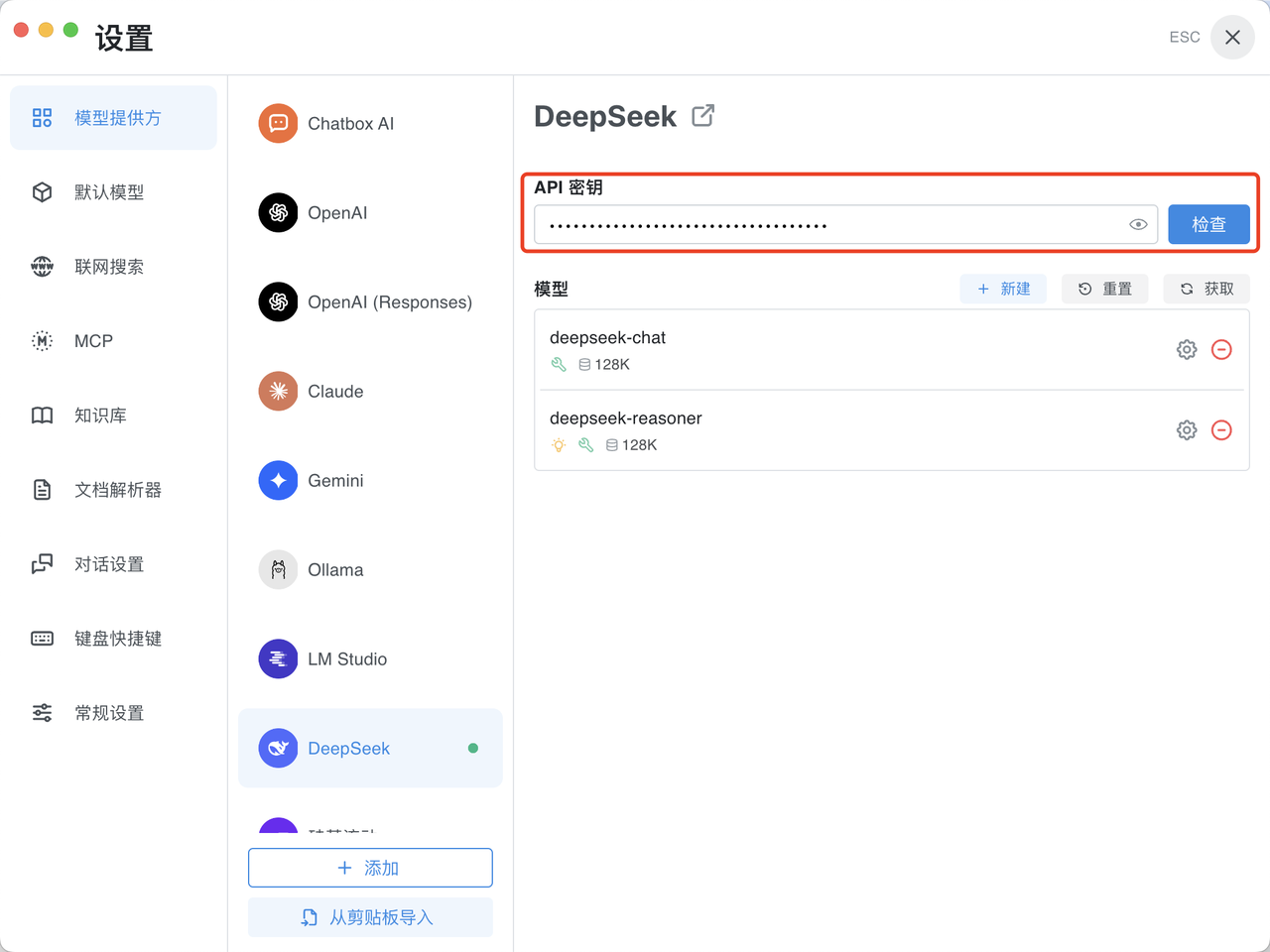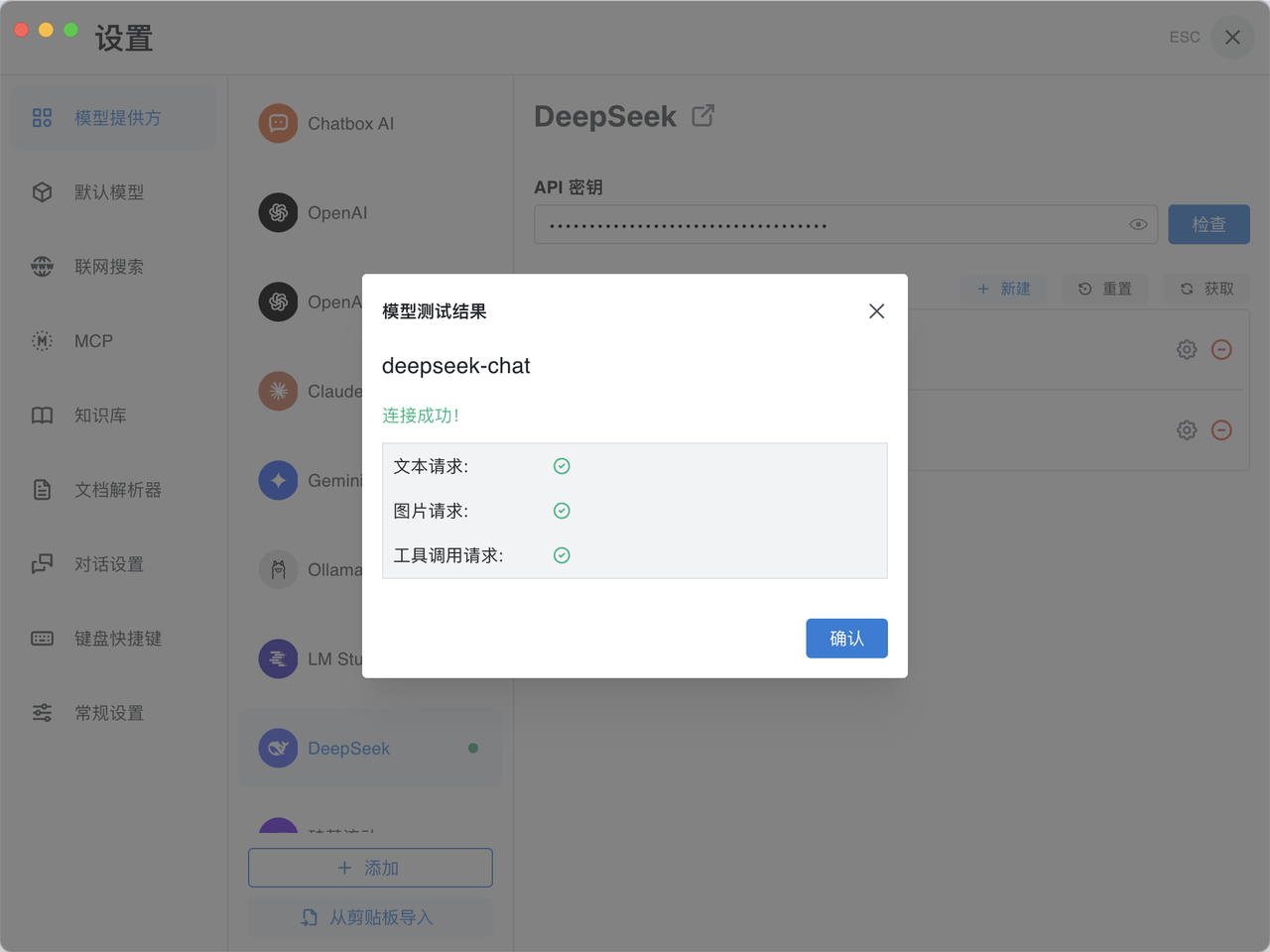 4、将API key复制粘贴到 Chatbox 的【API 密钥】配置框中,点击右侧的“检查”按钮,确保连接成功