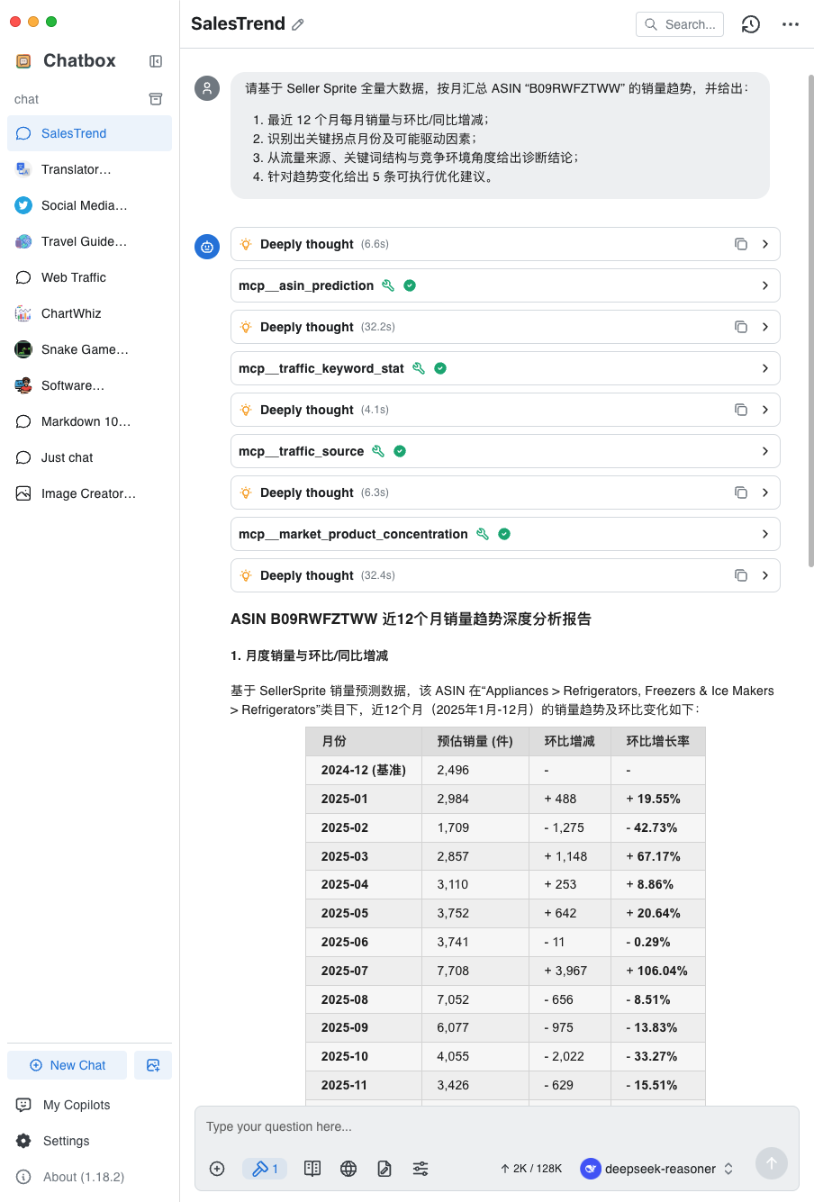 4、返回到对话界面,选择【卖家精灵】搭档,确认【卖家精灵MCP】已启用(按钮显示为蓝色即表示已启用),并选择刚刚配置好的AI大模型,即可开始对话